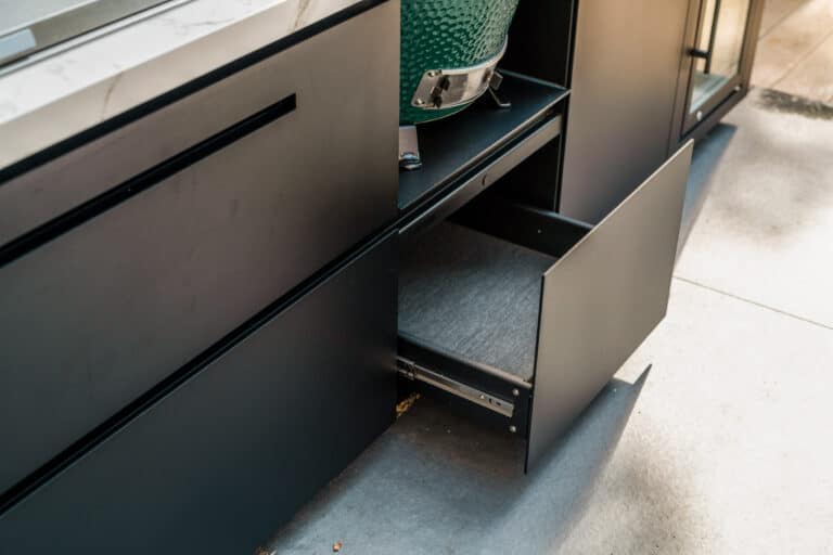 De keuken, ontworpen en vervaardigd door GBI-partner COOXS, is voorzien van luxe accessoires. Centraal staat de Big Green Egg Large. Deze barbecue wordt geflankeerd door een luxe gasbarbecue van het Australische merk Beefeater en een passende outdoor-koelkast. Deze combinatie van accessoires maakt van de buitenkeuken dé plek om samen te komen en te genieten van al het comfort dat buitenleven te bieden heeft.